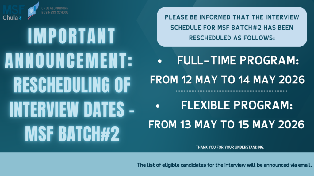 Chulalongkorn Business School and the program’s achievement of obtaining EQUIS accreditation reflects our commitment to continuous improvement and dedication to excellence in financial education. For more details regarding the accreditation of Chulalongkorn Business School, please refer to https://intl-accredit.acc.chula.ac.th